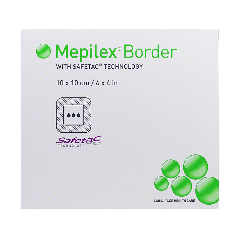Molnlycke Mepilex Border (4" by 4", part number 295300) absorbs moderate to high amounts of exudate from wounds, and maintains an optimum healing environment. The Safetac technology reduces the pain during removal and won't damage the wound. Pack of 3 boxes (5 dressings per box).