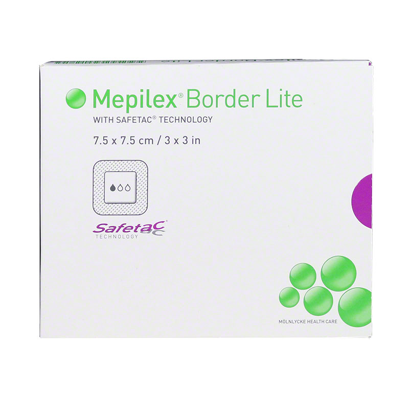 Molnlycke Mepilex Border Lite (3" by 3", part number 281200) is a thin, all-in-one foam dressing for lowly exuding acute or chronic wounds. It is very thin and discrete, and shower proof! Great for feet, toes, hands and fingers. Pack of 3 boxes (5 dressings per box).