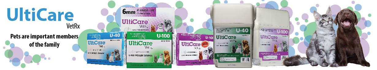 UltiCare VetRx® provides quality pet diabetes supplies including UltiCare Pet syringes, the iPet Diabetes Glucose Monitor and iPet diabetic test strips. UltiCare developed the proprietary UltiGuard™, packaging insulin syringes with-in a dispenser and disposal container that is less expensive than the leading brand insulin syringe.